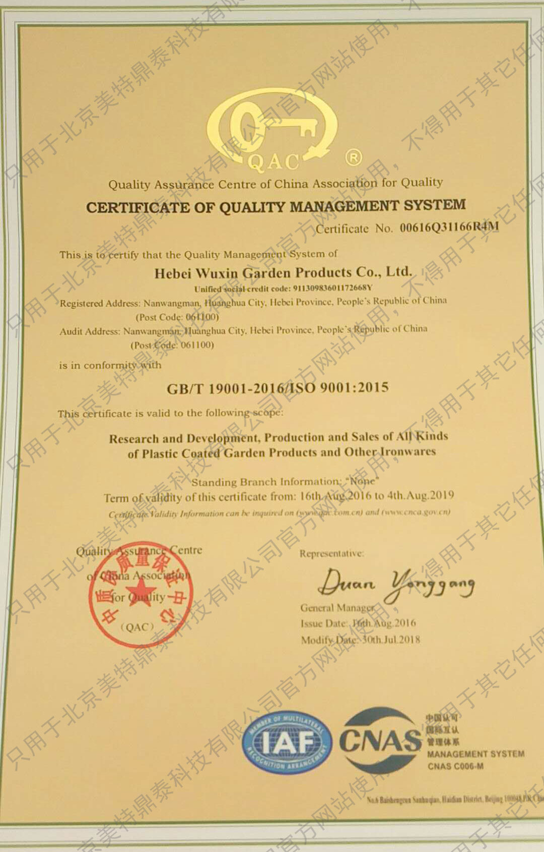 ISO9001 Quality System Certificate